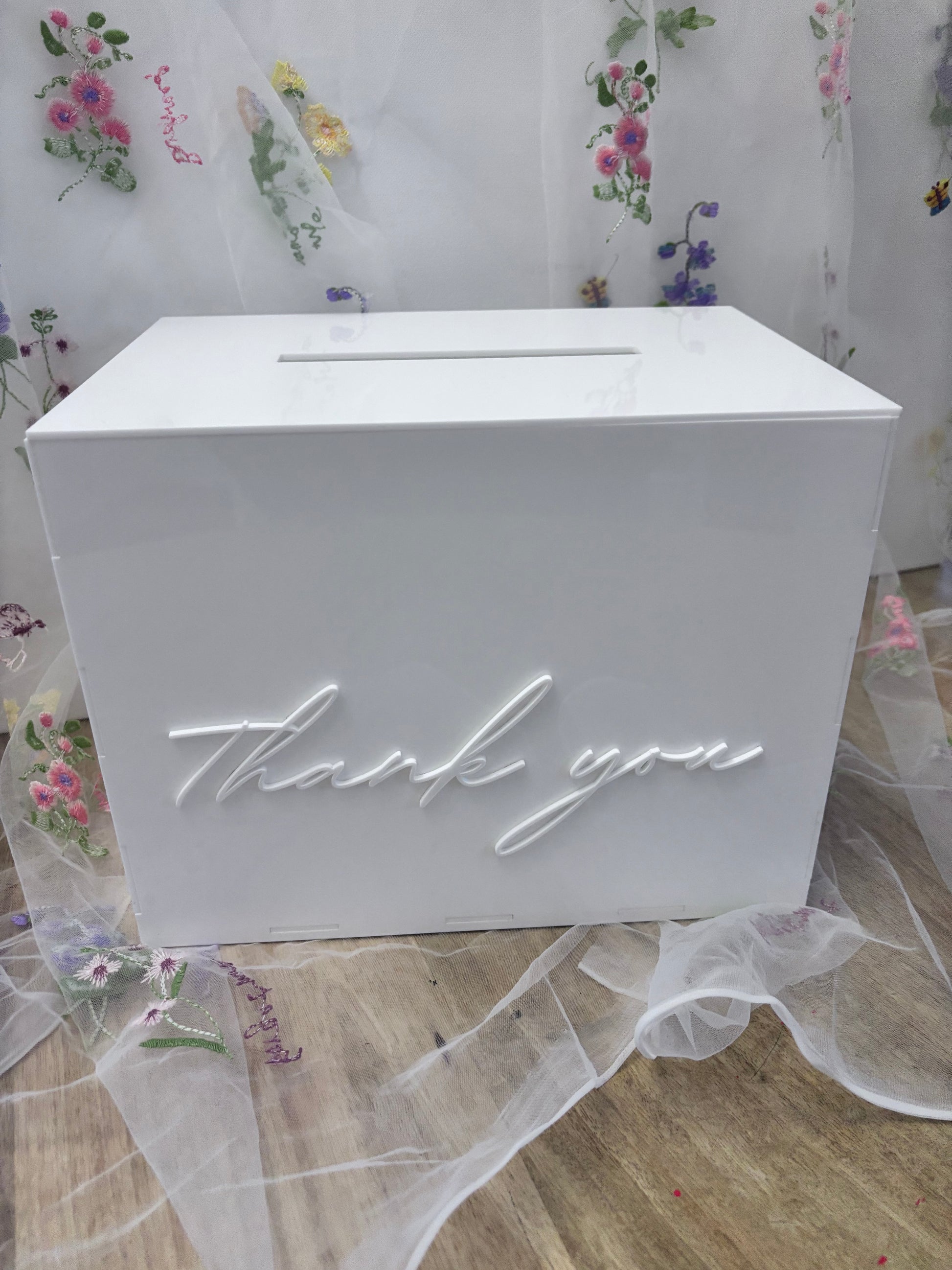 Elevate your wedding decor with our Acrylic Card Box. Personalized with raised text, this box serves as a stylish wishing well for your special day. Customize the front with "Thank You" or "Mr. and Mrs." for a luxurious touch. Make it truly yours with your own choice of text.