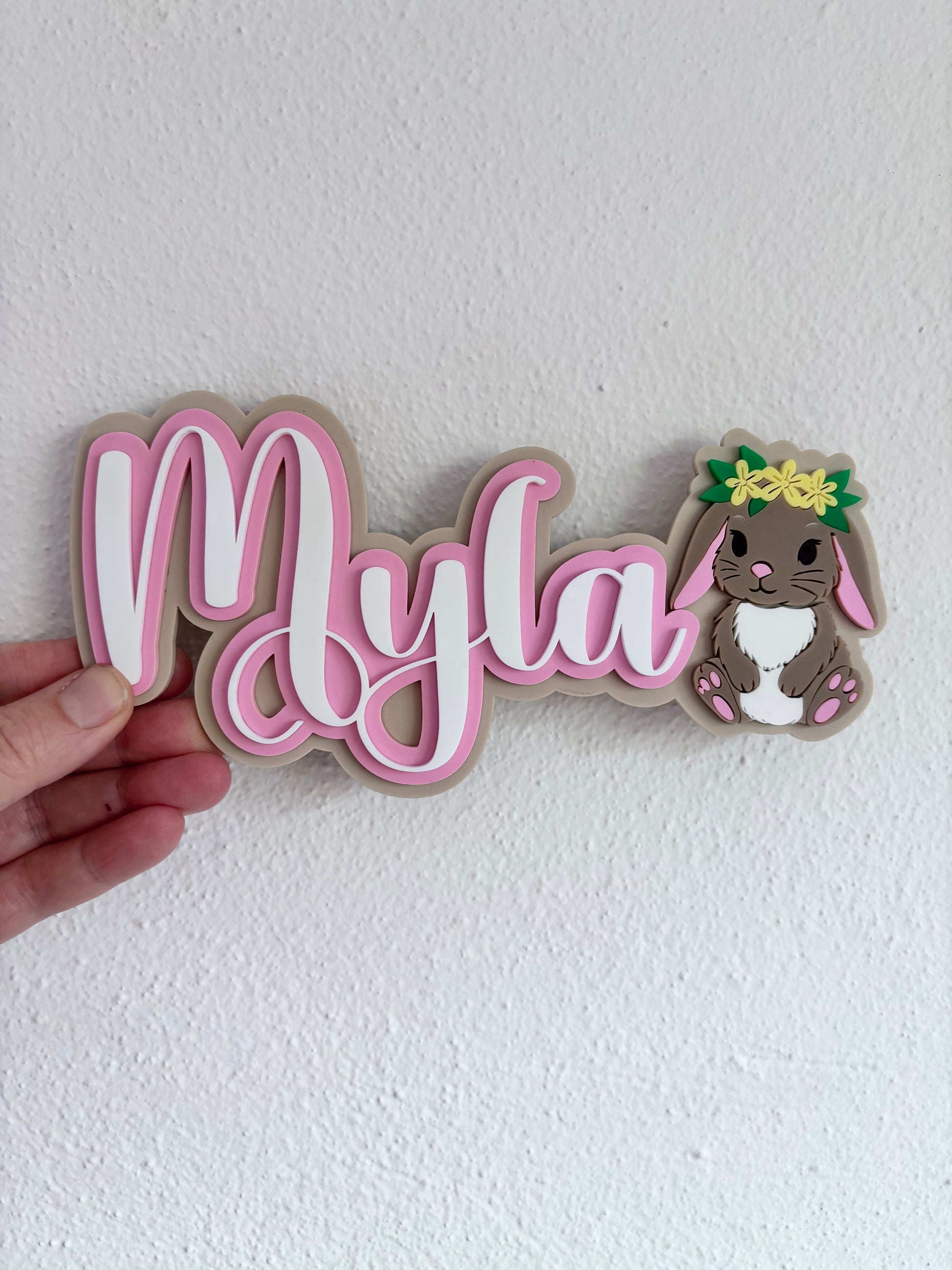 This sign is made from 3mm layered acrylic and is great for door or wall signage. The design is multi-colour with 2 layers with a cursive style font and bunny at the end of the name. Based on name size will determine how big the bunny will be.