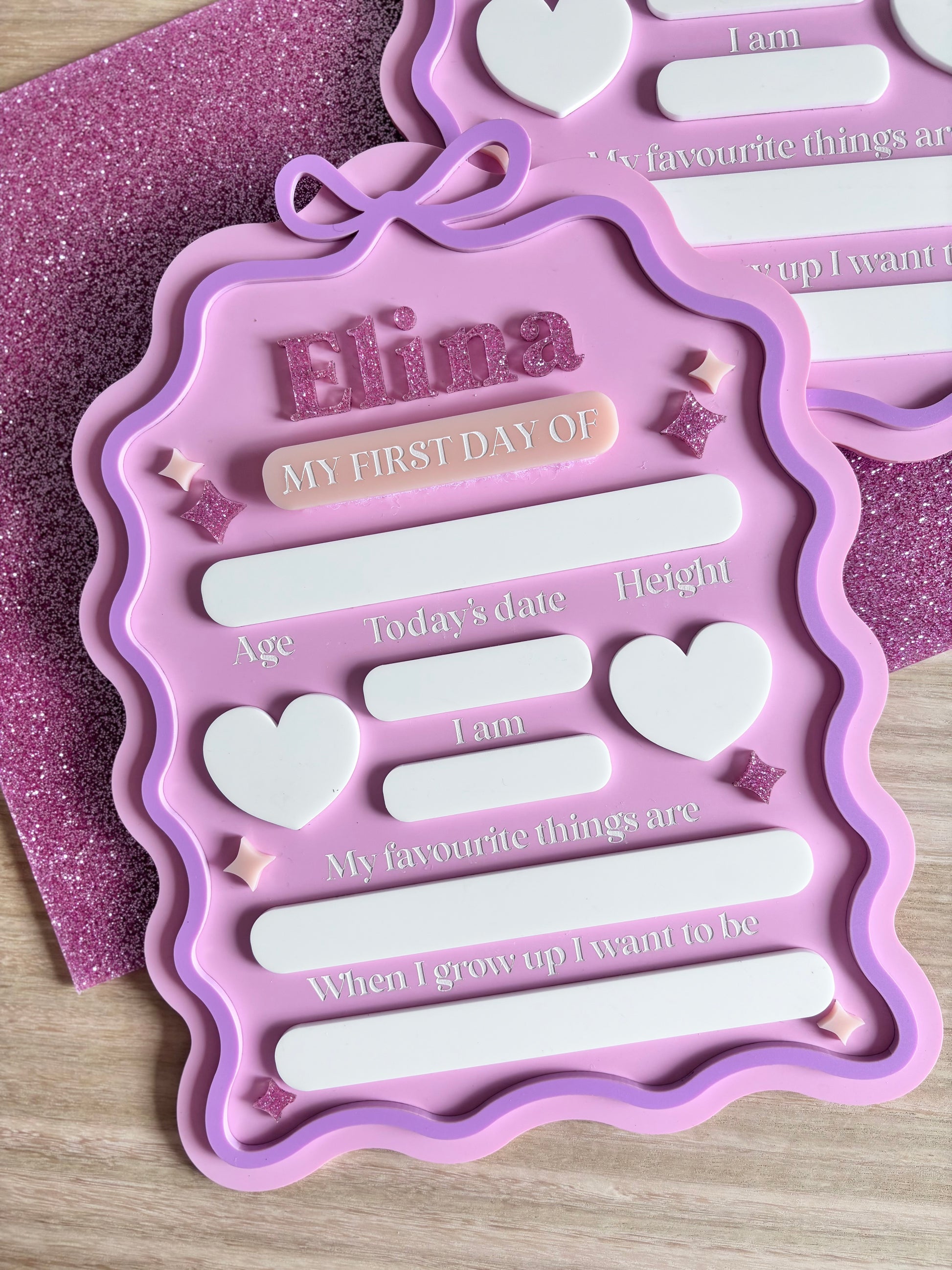 Our boards are customised with your child's name at the top, which we have made interchangeable depending on your need. Interchangeable option is affixed with Velcro strips for ease. If additional names are purchased the board will come with Velcro on the reverse side for storage of the additional piece when not in use (Additional names can be purchased on our site if needed.