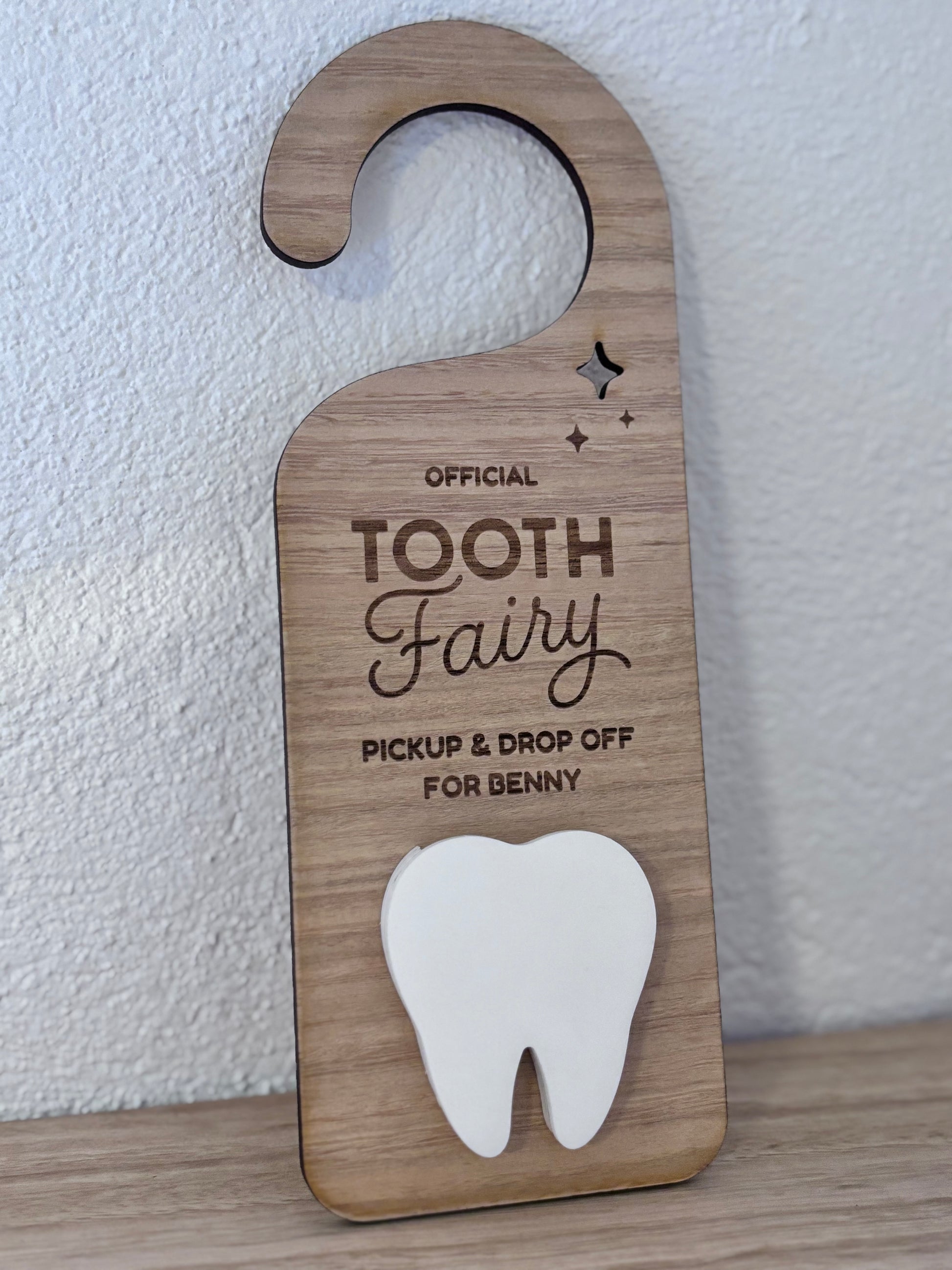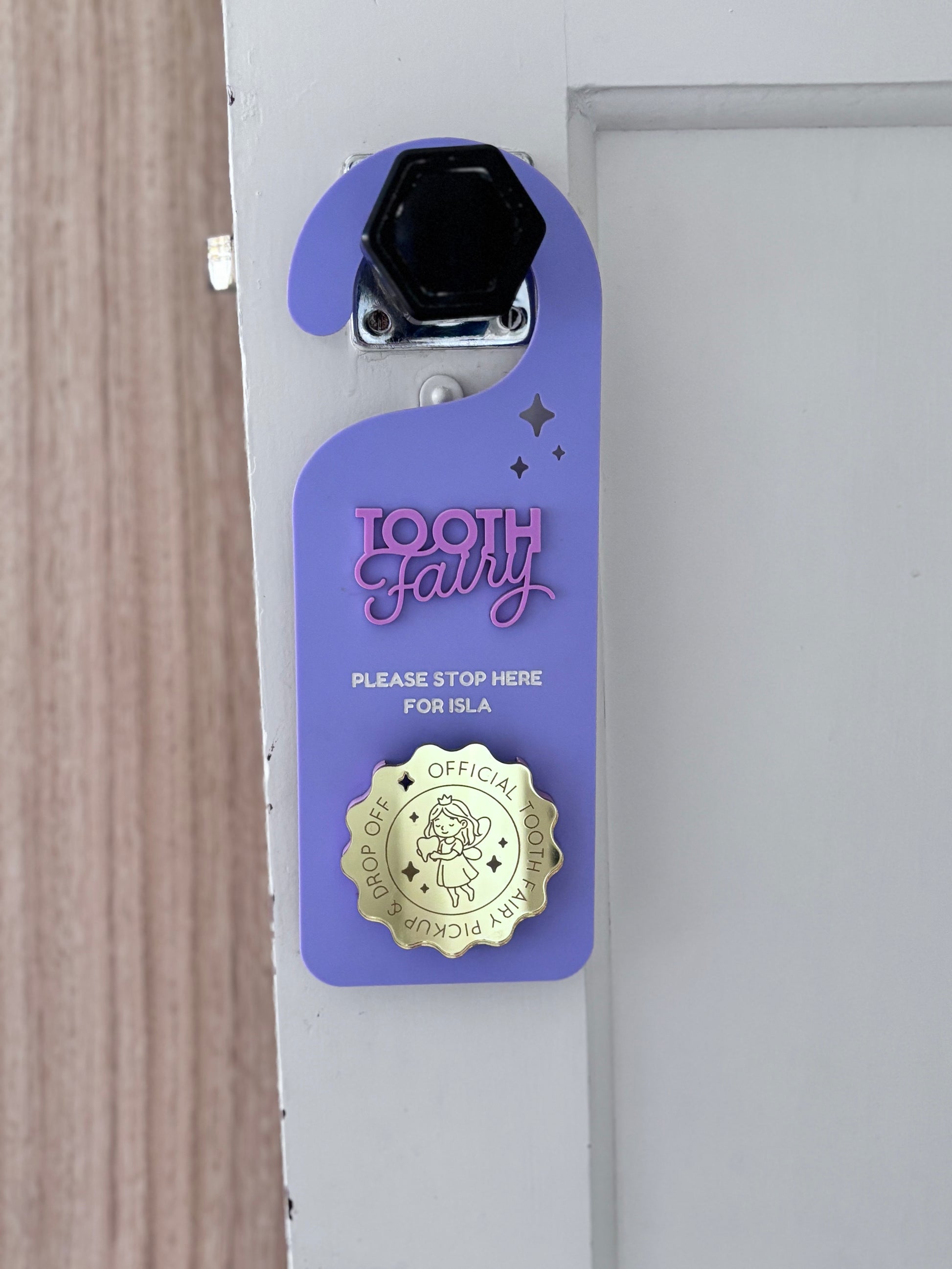 Welcome the tooth fairy in style with this charming door hanger! Personalised with your child's name, it announces when they're ready for a visit. Choose from four delightful designs, a shimmering gold token, a classic tooth, a magical fairy token, or a golden fairy, to match your little one's personality. Simply hang it on the door to signal pickup and drop-off, making the tooth fairy experience extra special and memorable. A whimsical touch that turns a milestone moment into pure magic!