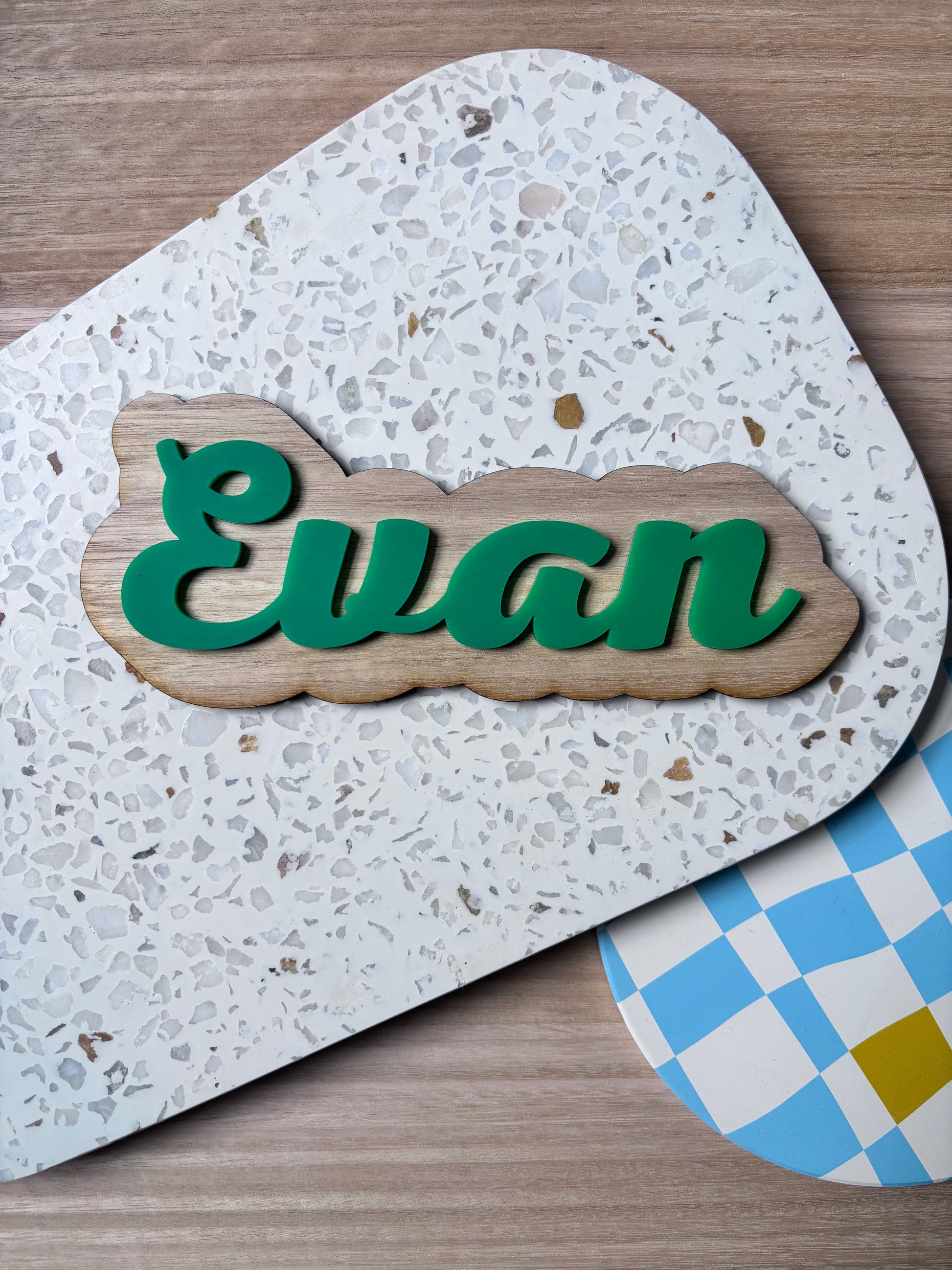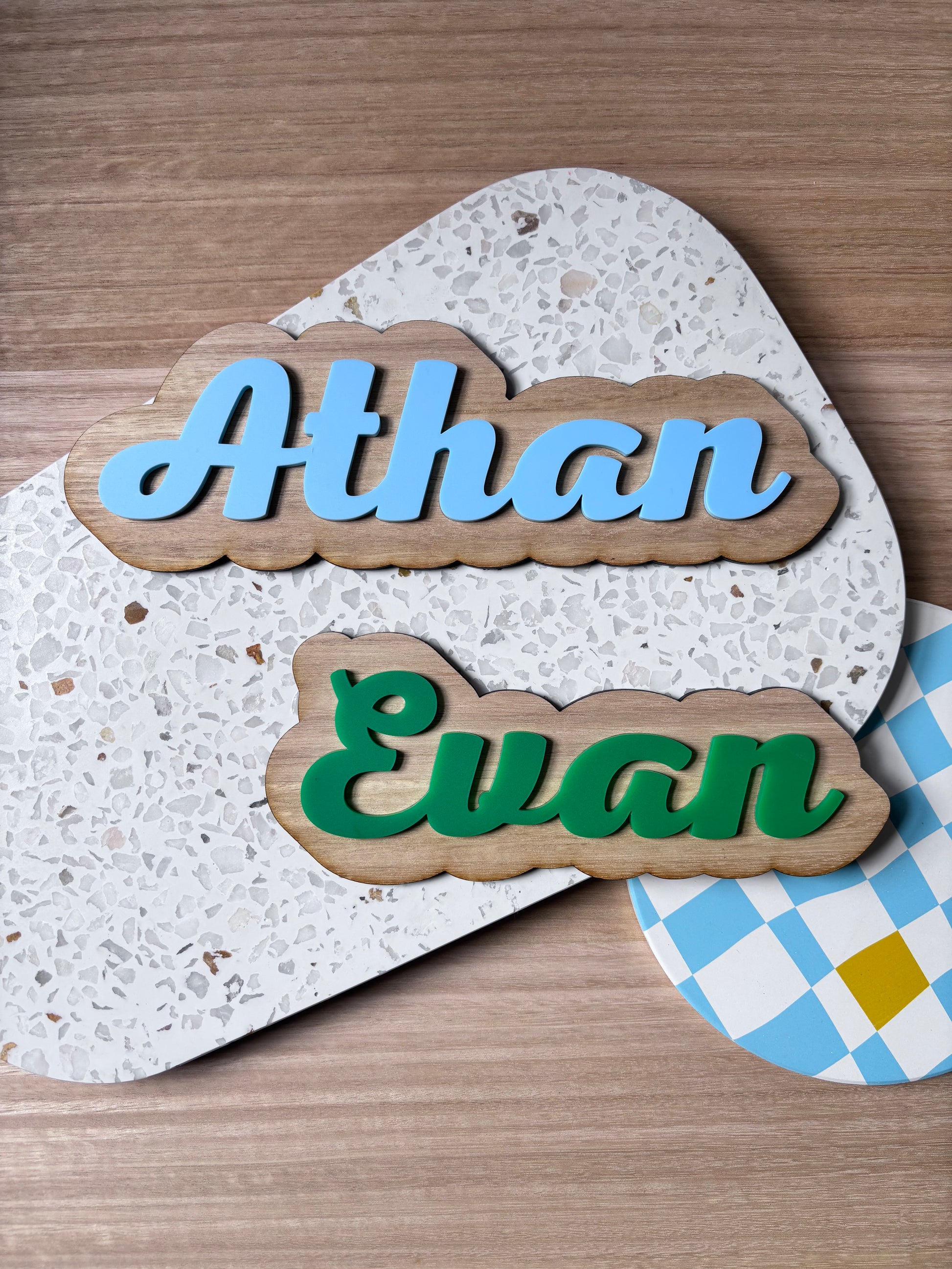 This sign is made from 3mm layered wood and acrylic and is great for door or wall signage. The design is multi-colour with 2 layers (wood base, acrylic upper) with font choice as provided.